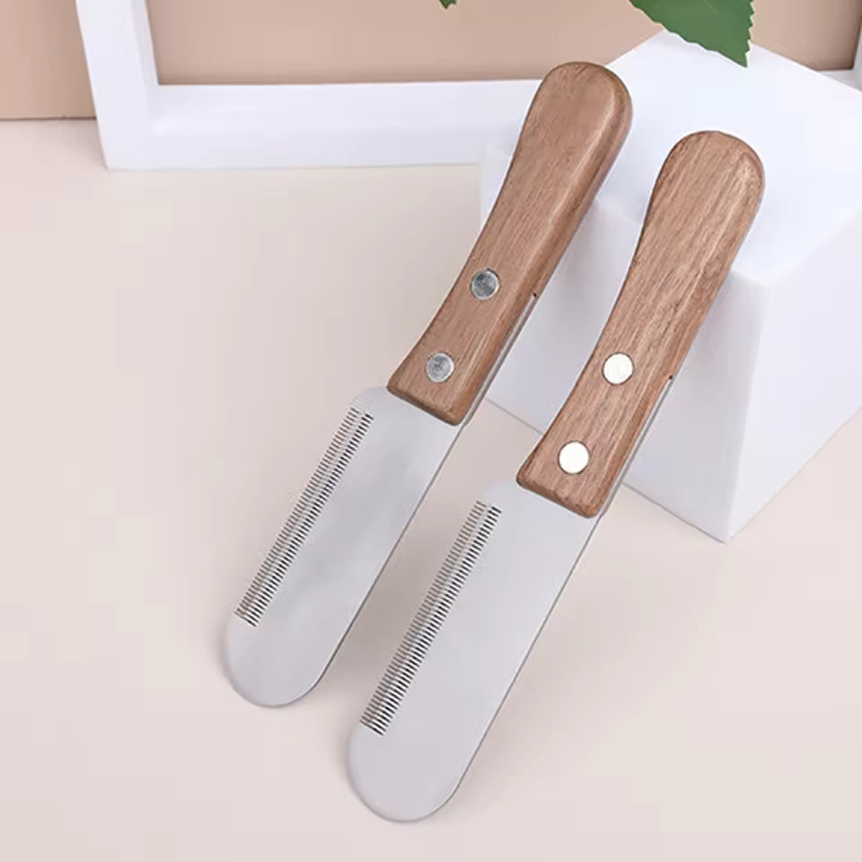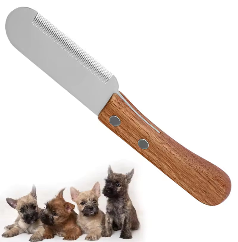 The ergonomic wooden handle offers a comfortable and secure grip, reducing hand fatigue during grooming sessions. It allows better control for accurate trimming and stripping.